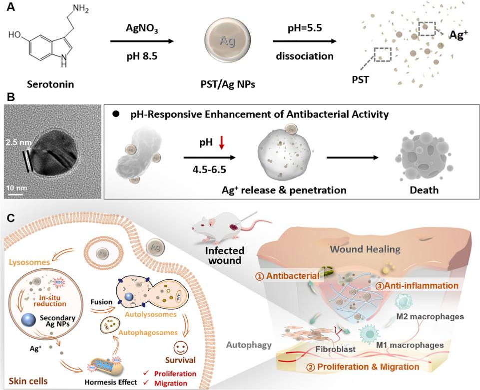 A)PST/Ag納米顆粒的制備過程及其在酸性微環(huán)境中響應(yīng)性降解示意圖。通過5-羥色胺在堿性條件下的自氧化聚合,實現(xiàn)銀離子的原位還原并形成聚羥色胺(PST)包覆層;該殼層在感染相關(guān)的弱酸環(huán)境中可降解,促進Ag?釋放。B)PST/Ag在感染部位的抗菌機制示意圖。Ag?釋放后高效破壞細菌結(jié)構(gòu)并清除生物膜,實現(xiàn)廣譜快速殺菌。C)PST/Ag在哺乳動物細胞中的良好生物相容性及其促愈合作用示意圖。通過調(diào)控細胞氧化還原穩(wěn)態(tài)、誘導(dǎo)自噬、促進細胞增殖遷移及免疫微環(huán)境重塑,協(xié)同提升組織修復(fù)效果并預(yù)防瘢痕形成。